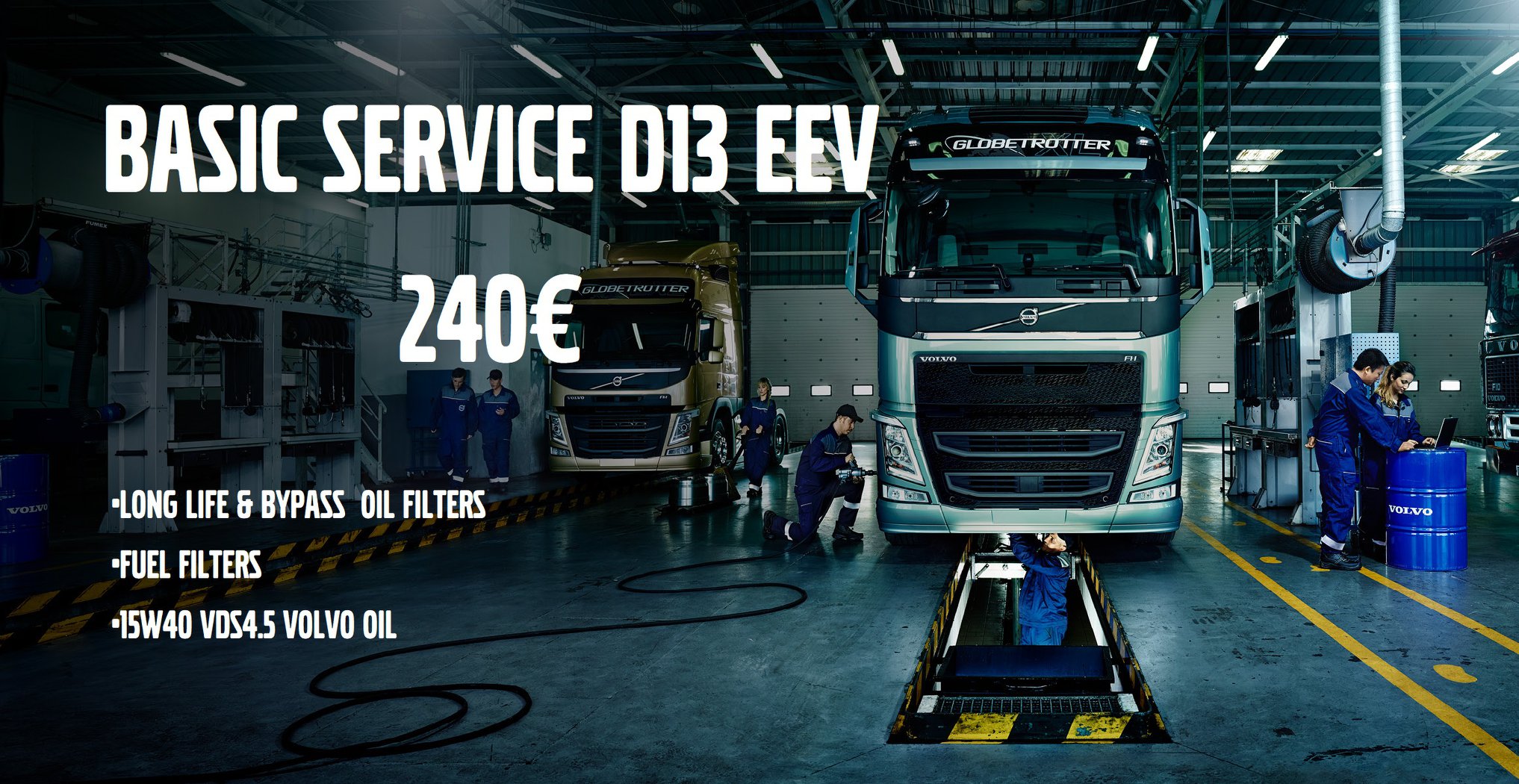 Η προσφορά περιλαμβάνει φίλτρα λαδιού, πετρελαίου, λιπαντικό Volvo 10w30 VDS4.5. Ισχύει για πληρωμή μετρητοίς, δεν περιλαμβάνεται ο ΦΠΑ και το κόστος αντικατάστασης.